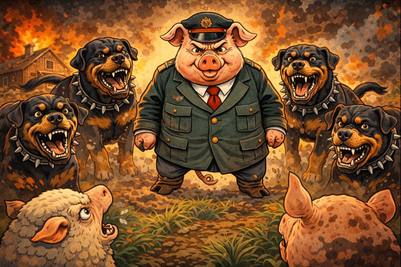 „Gyvulių ūkis“ citatos aiškiai parodo, kad šis kūrinys nėra tik pasakojimas apie gyvulių sukilimą – tai nuoseklus įspėjimas apie tai, kaip idėjos, atrodžiusios teisingos ir išlaisvinančios, gali virsti priespaudos įrankiais. Orwellas per trumpas, tikslias formuluotes atskleidžia visą valdžios mechanizmą: nuo viliojančių lygybės pažadų iki baimės, paklusnumo ir galutinio moralinio nuopuolio.