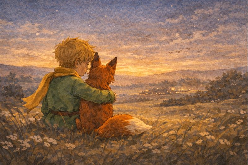 Lapė ir Mažasis princas ramiai sėdi pievoje – kantrybės, lėto ryšio ir išminties prasmė knygoje „Mažasis princas“